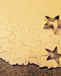 - Once the dough has chilled, cut each disc in half, keep the other half refrigerated until ready to use. On a well floured surface, roll out dough to 1/4-inch thick. Using a star shaped cookie cutter, cut into shapes. Place cookies onto a parchment lined baking sheet.