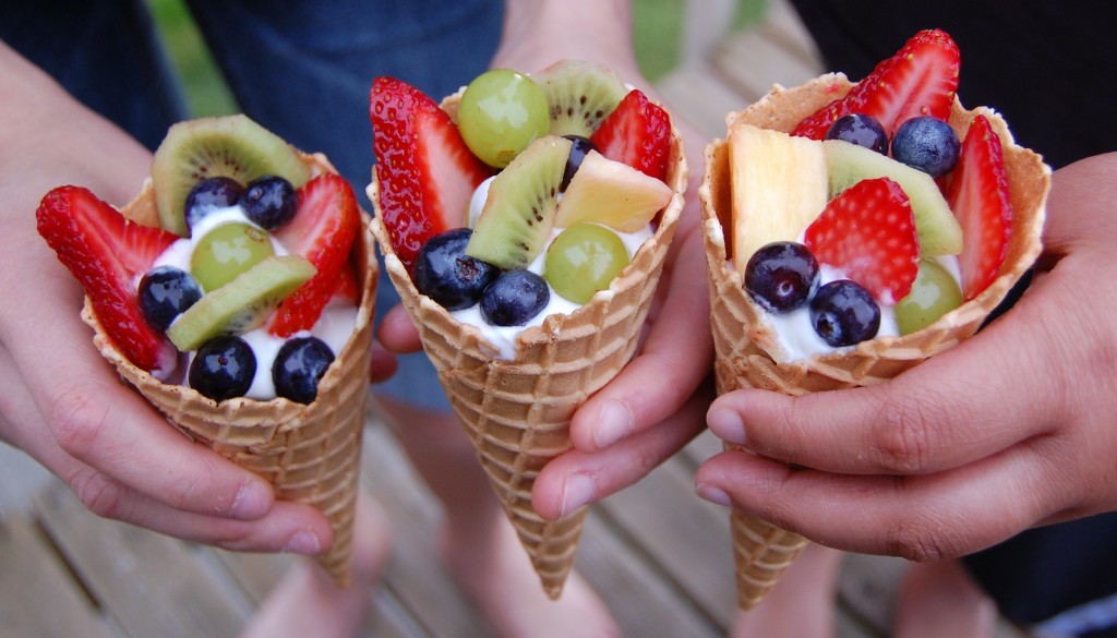 • Fill a waffle cone with a spoon full of vanilla yogurt, then a layer of mixed fruit. Add another spoonful of yogurt, then top it off with fruit. Enjoy!