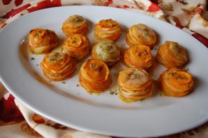 - Layer the potatoes evenly in the prepared muffin tin, stacking them one on top of the other until they are about 1-inch above the top of each muffin cup.