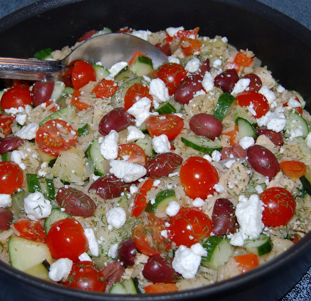 Turn a classic Greek sandwich into an easy weeknight dinner. Chicken, rice, onion, peppers, tomatoes, cucumbers, and Kalamata olives topped with fresh dill and feta cheese!