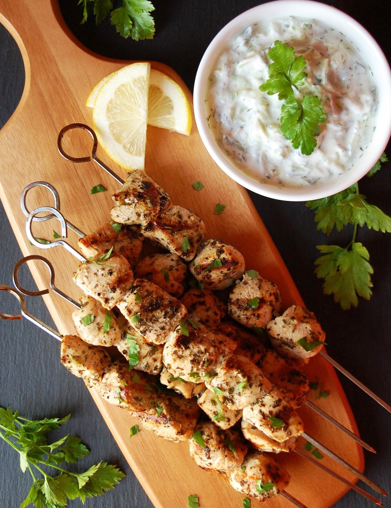 Serve our flavorful lemon and herb chicken skewers with pita or naan bread drizzled with homemade tzatziki sauce.