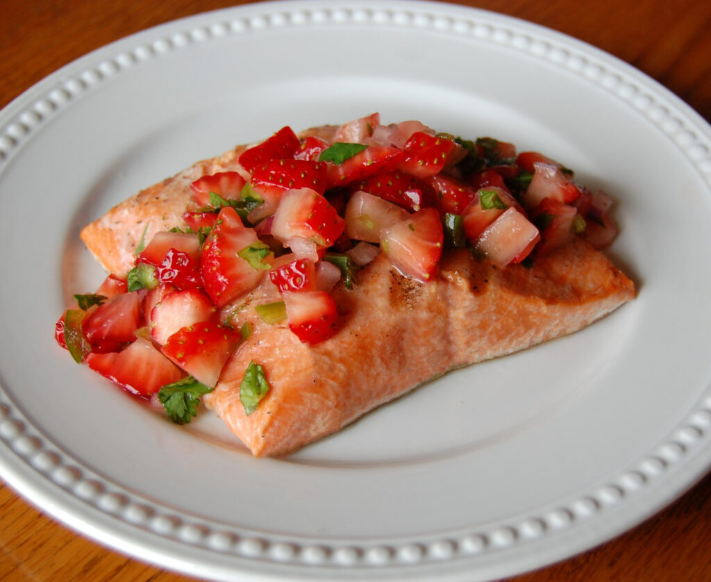 Wild salmon topped with sweet and spicy strawberry salsa. The ultimate summer dish!