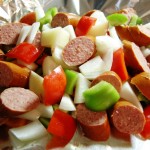 - On a heavy duty sheet of foil, place potatoes, onions, peppers and sausage. Season with salt and pepper. Sprinkle with olive oil and top with butter. Tightly seal around the ingredients, leaving a small opening at one end. Pour water into the opening and seal.