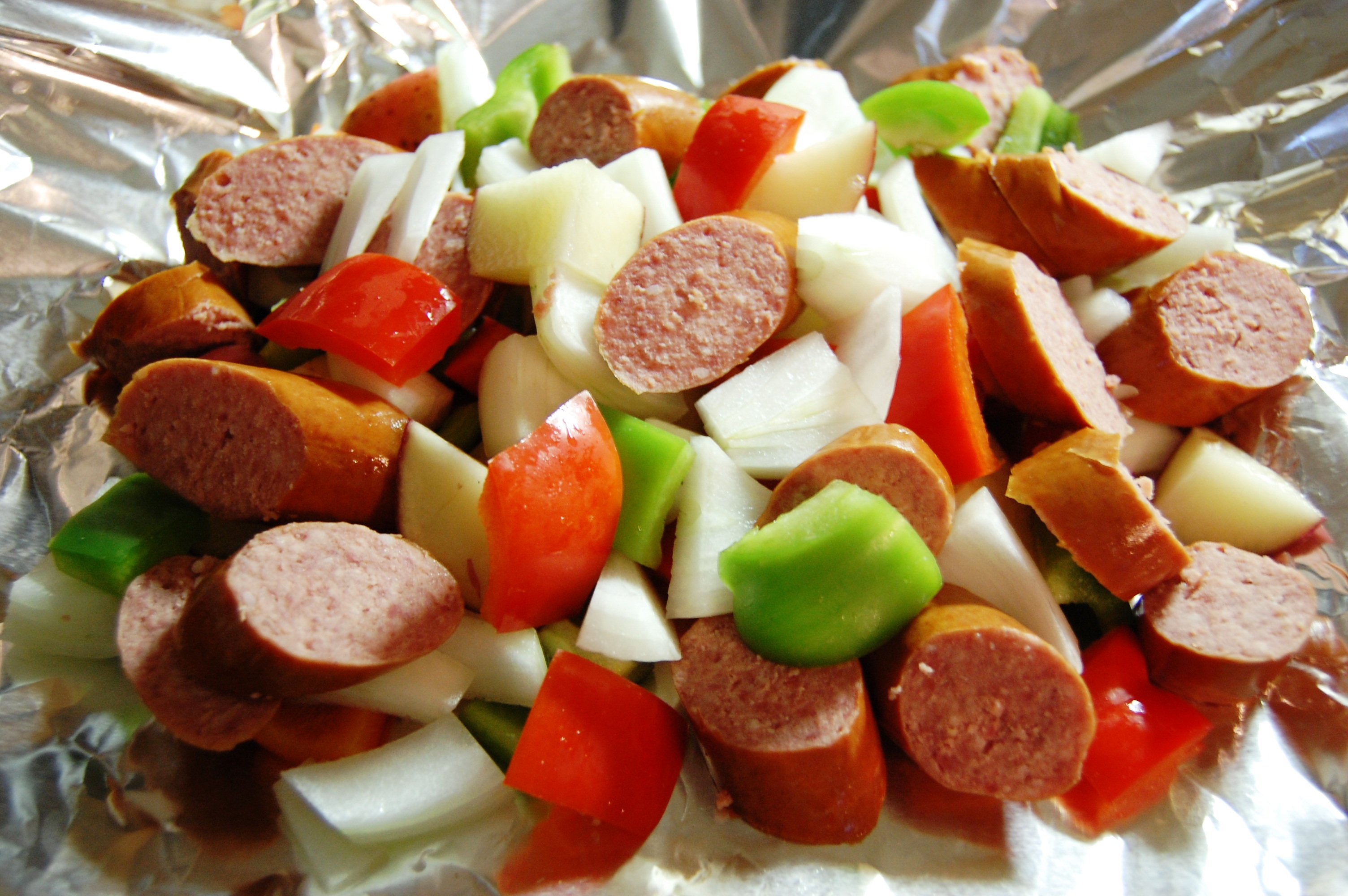- On a heavy duty sheet of foil, place potatoes, onions, peppers and sausage. Season with salt and pepper. Sprinkle with olive oil and top with butter. Tightly seal around the ingredients, leaving a small opening at one end. Pour water into the opening and seal.