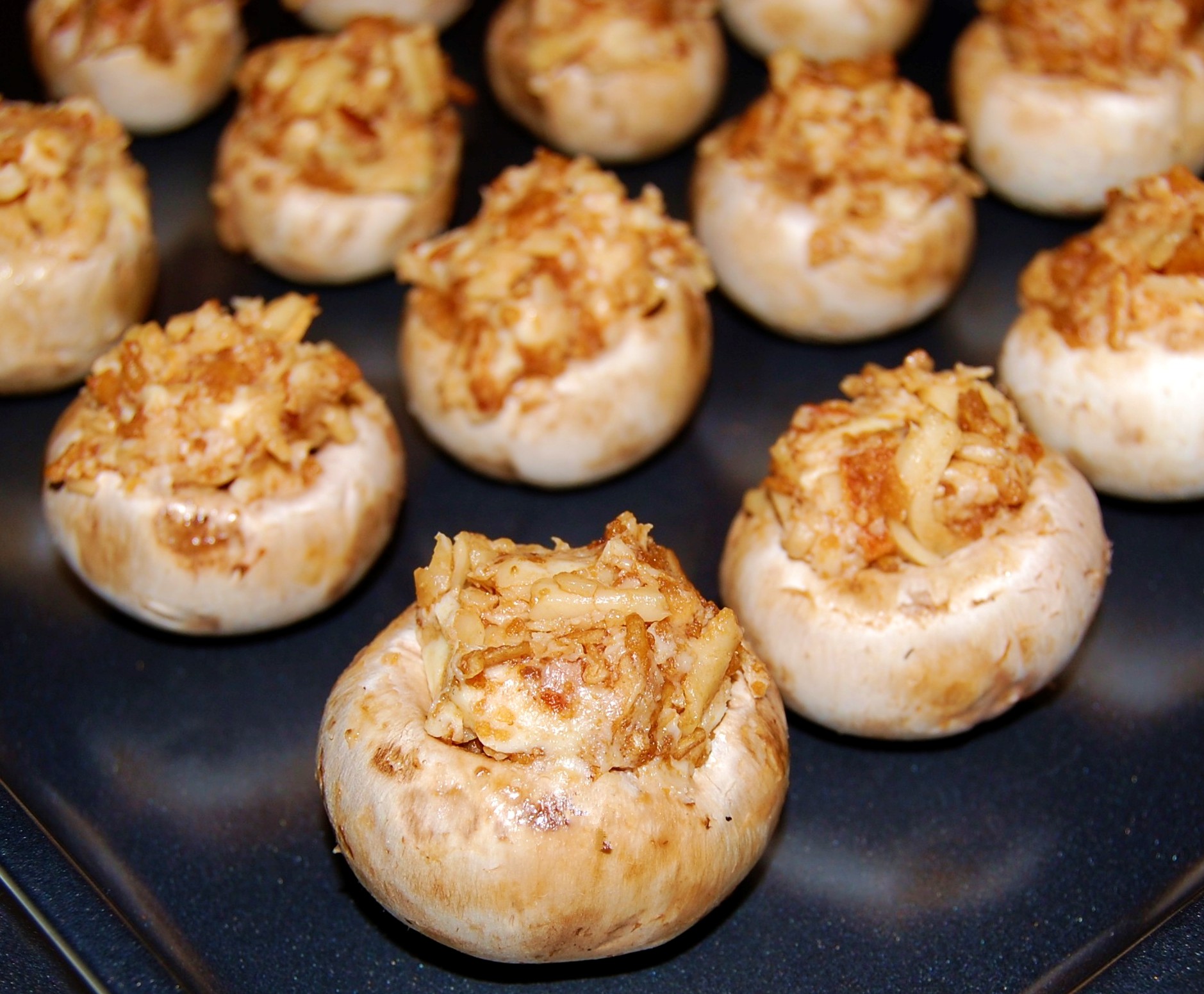 - Fill mushroom caps with mixture. Place back on baking sheet and broil for three minutes or until bubbly and light brown.