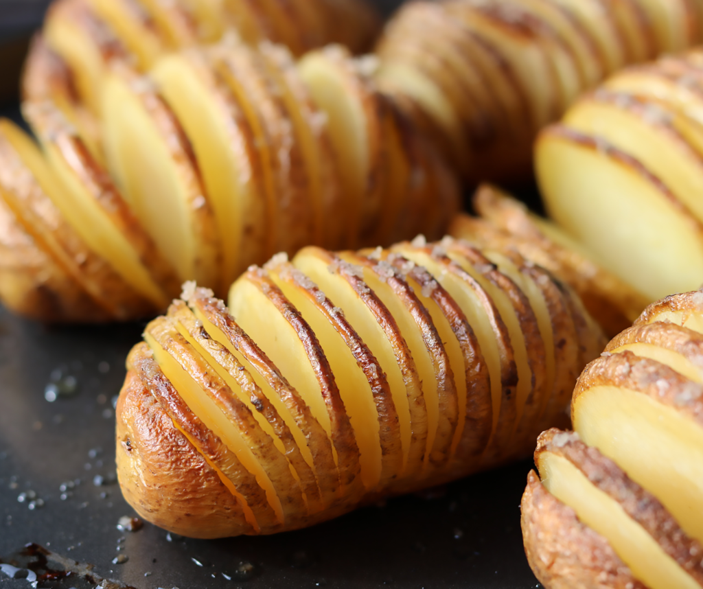 - Place potatoes into a large wooden spoon. Using a sharp knife, make slices across the potato, about 1/8 to 1/4 inch apart, making sure to cut down to the lip of the spoon, not all the way through the potato. The slices should stay connected at the bottom, like an accordion. The spoon helps keep the depth even, proceed with the remaining potatoes. When all of the potatoes are cut, place them cut-side up on a foil lined baking sheet.