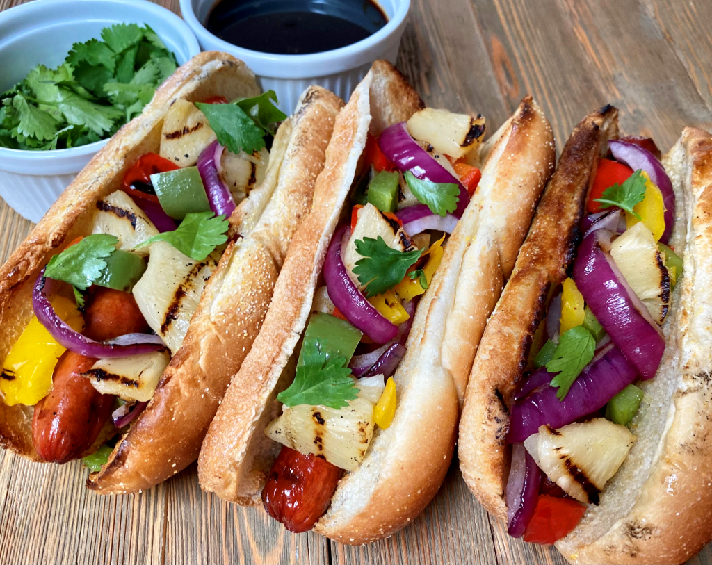 Grilled hot dogs topped with teriyaki pineapple, bell peppers, and onions served on toasted outdoor buns!