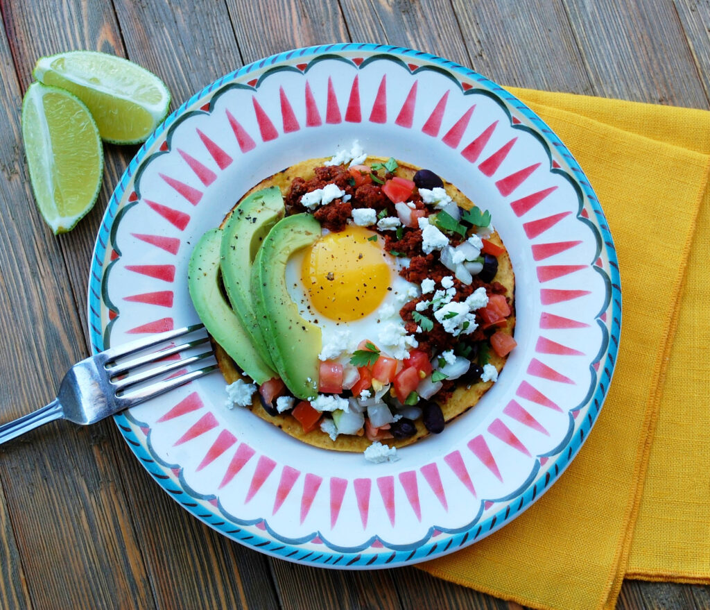 - To Serve: Place warmed tostada shells on each plate. Top with warmed black beans, eggs sunny-side-up, Mexican chorizo, ranchero sauce, Pico de Gallo, sliced avocados, pickled jalapenos, cilantro, Cojito cheese and freshly ground black pepper to taste.