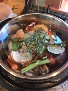 - In the bottom of your instant pot liner, place the onion skins, bones, vegetables, vinegar, spices and herbs. Fill with cold water to the line just below the “max” line.