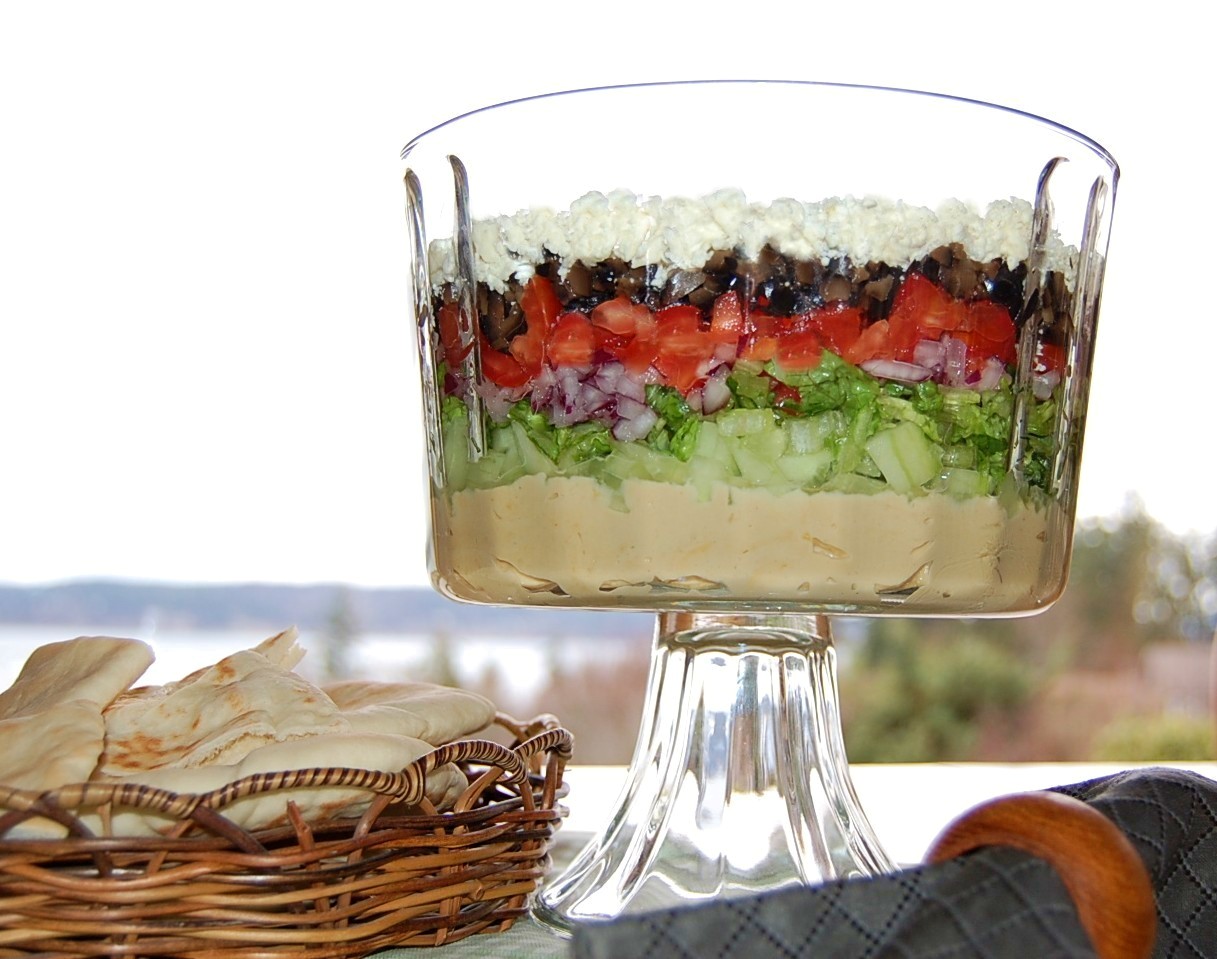 - Spread hummus evenly in the bottom of a 9 x 13-inch glass baking dish, trifle bowl or pretty clear serving dish.