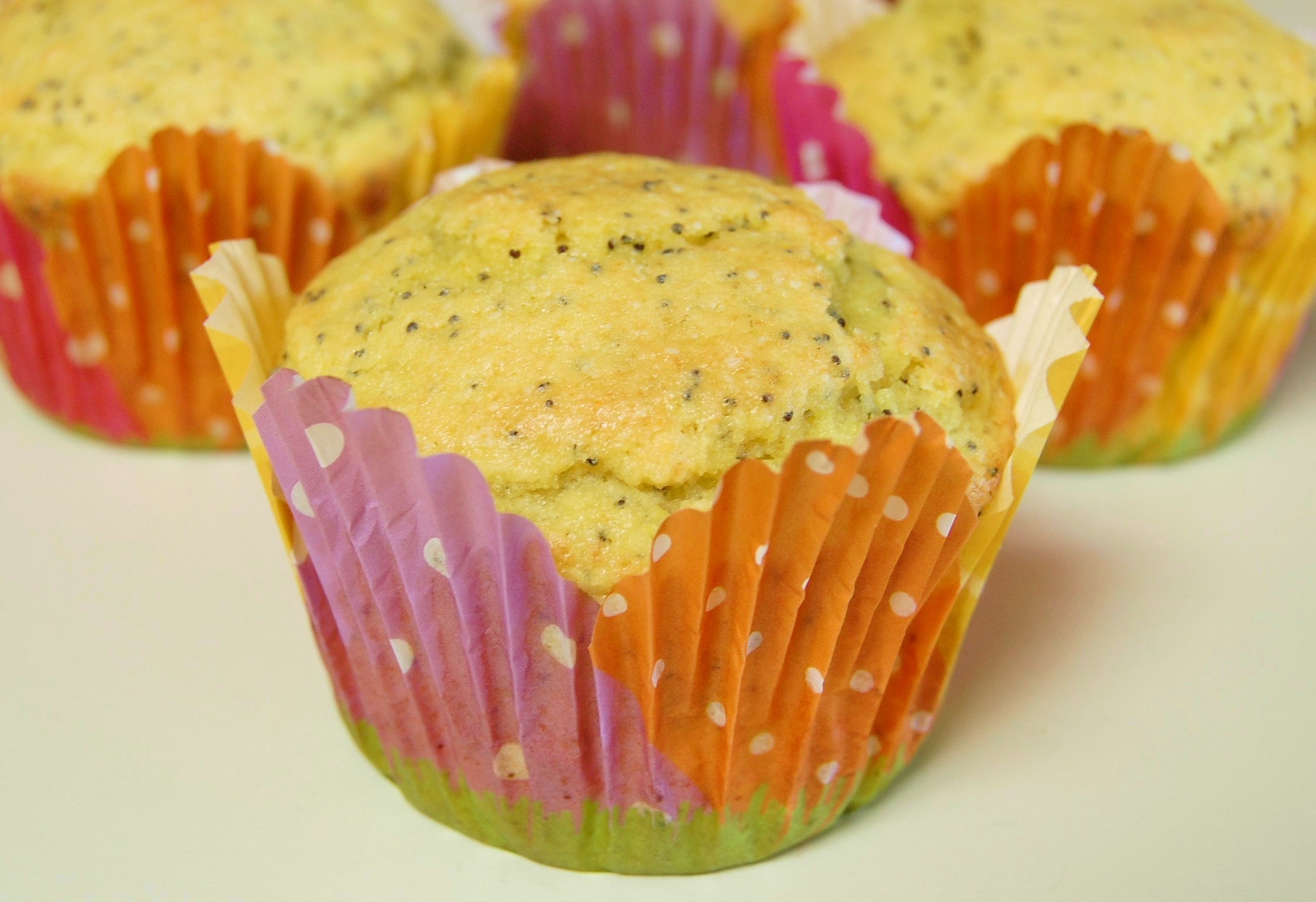 - In a large bowl, whisk together flour, sugar, poppy seeds, baking powder, baking soda and salt, set aside.