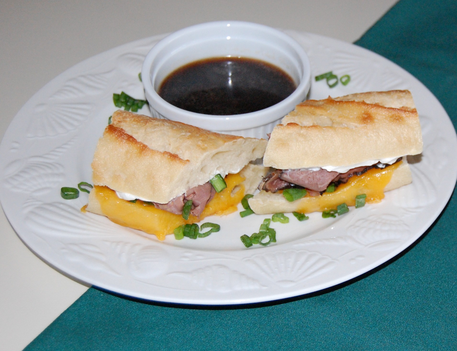 - To heat meat, dip beef in au jus (about 1 minute) and place on bread over cheese. Spread sour cream over the other side of French bread. Sprinkle with green onions, close and slice sandwich diagonally. Serve with a side of au jus for dipping, a dill pickle spear, potato salad, potato chips or fries.