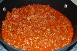 - In a large skillet over med-high heat, sauté onion in 1 tablespoon olive oil, until translucent. Add garlic, ground beef, and sausage. Cook until no longer pink. Add your favorite spaghetti sauce and reduce the heat to low.