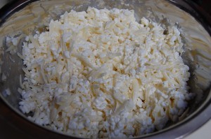 - In a large bowl, combine cottage cheese and mozzarella; set aside.