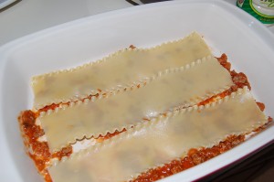 - Preheat oven to 375 degrees. To assemble: Spread a thin layer of spaghetti sauce in the bottom of a 9x13-inch baking dish to prevent the noodles from sticking. Lay 3-4 noodles over the sauce, overlapping noodles to fit.