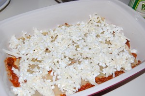 - Top with 1/3 of the cheese mixture and 1/3 of the spaghetti sauce. Repeat 2 more times (noodles, cheese, sauce), ending with sauce. Sprinkle parmesan over the top.