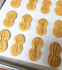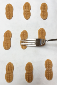 - Form the chilled dough into 1-inch balls (1 teaspoonful of dough) and then roll them into a 2-inch log shape. Place them on baking sheet about 2-inches apart. Using a fork, press down on the dough creating a criss-cross pattern. Pinch the center to create the peanut shape.