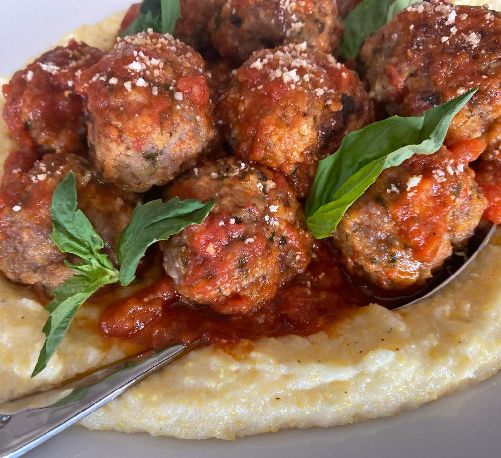 Tender meatballs simmered in homemade marinara sauce served over smooth, creamy polenta. A dish that warms the heart and satisfies the soul. Perfect any time you’re craving a comforting home-cooked meal.