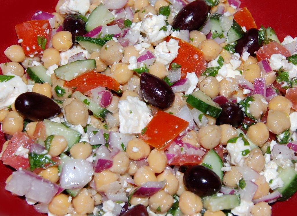 - In a large bowl, toss together the garbanzo beans, tomatoes, feta cheese, onion, cucumber, olives, garlic, and cilantro.