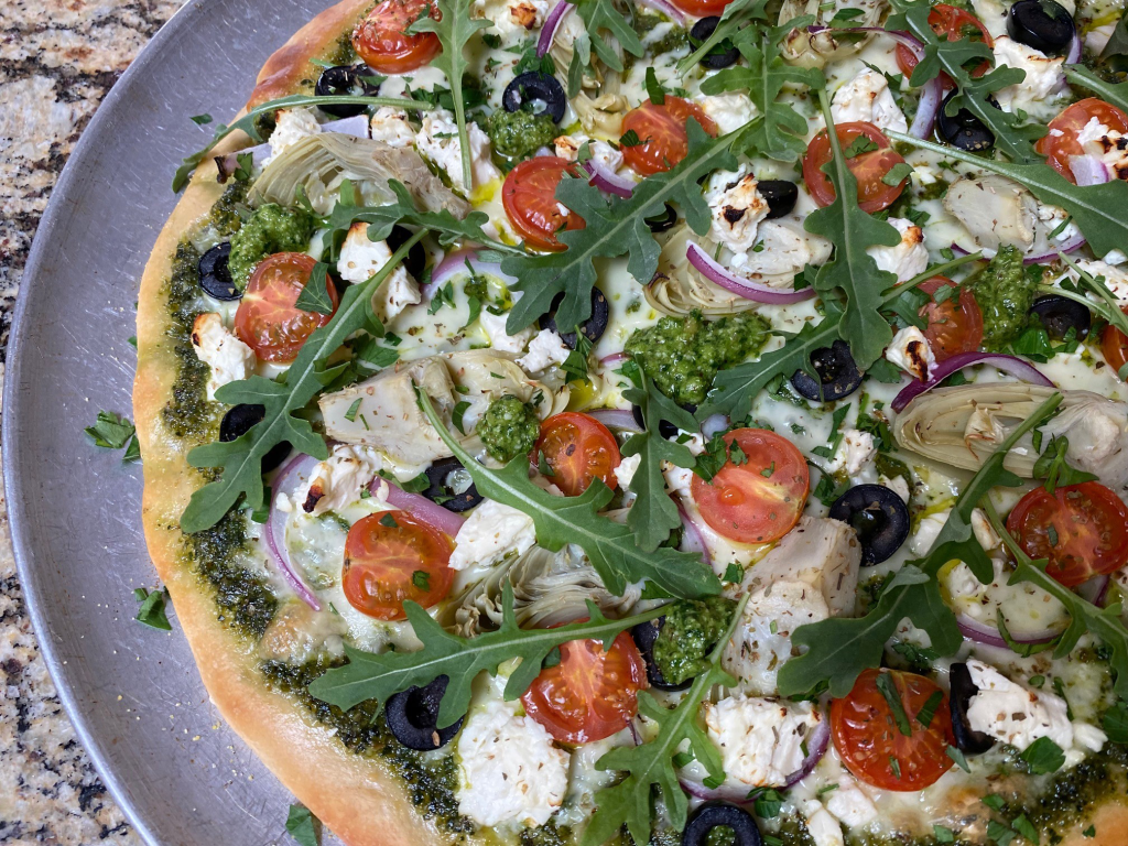 This Greek inspired pizza is topped with homemade spinach pesto, tomatoes, red onion, black olives, artichoke hearts, and mozzarella and feta cheeses, Enjoy!