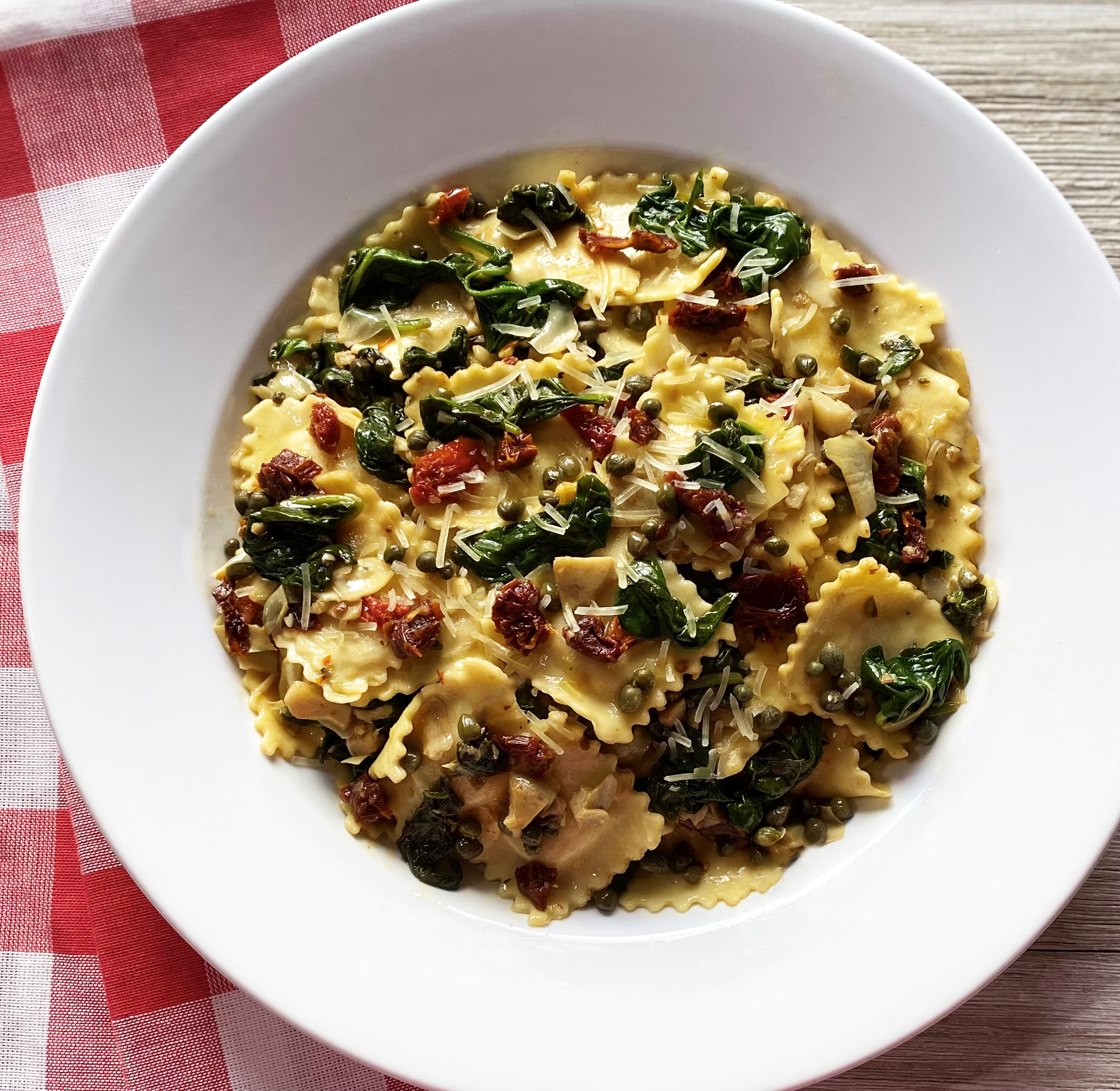 Cheese or pesto filled ravioli with sautéed spinach, sun-dried tomatoes, artichokes, and capers.