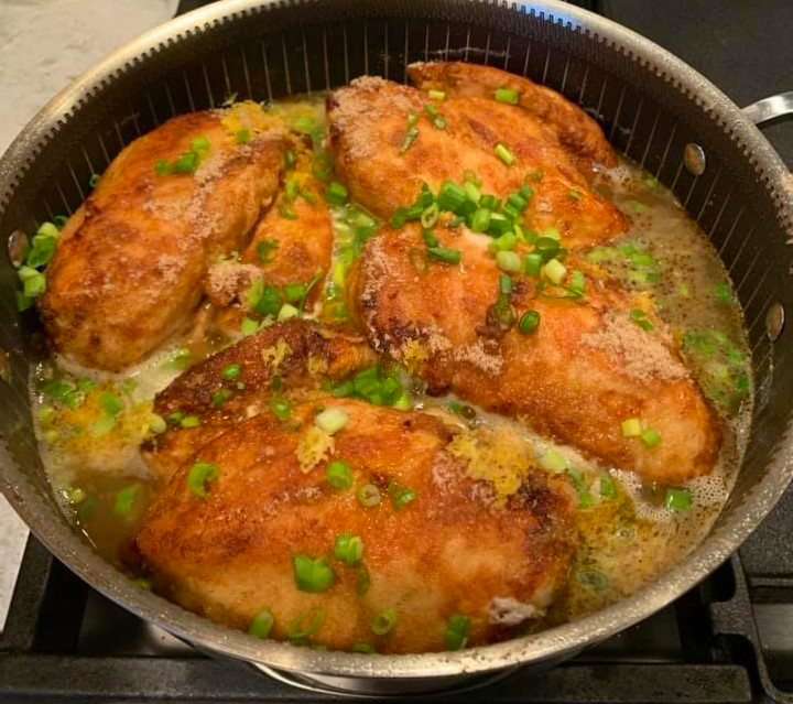 - After browning is completed, add the chicken stock, green onion, lemon zest, remaining lemon juice and brown sugar to the pan.