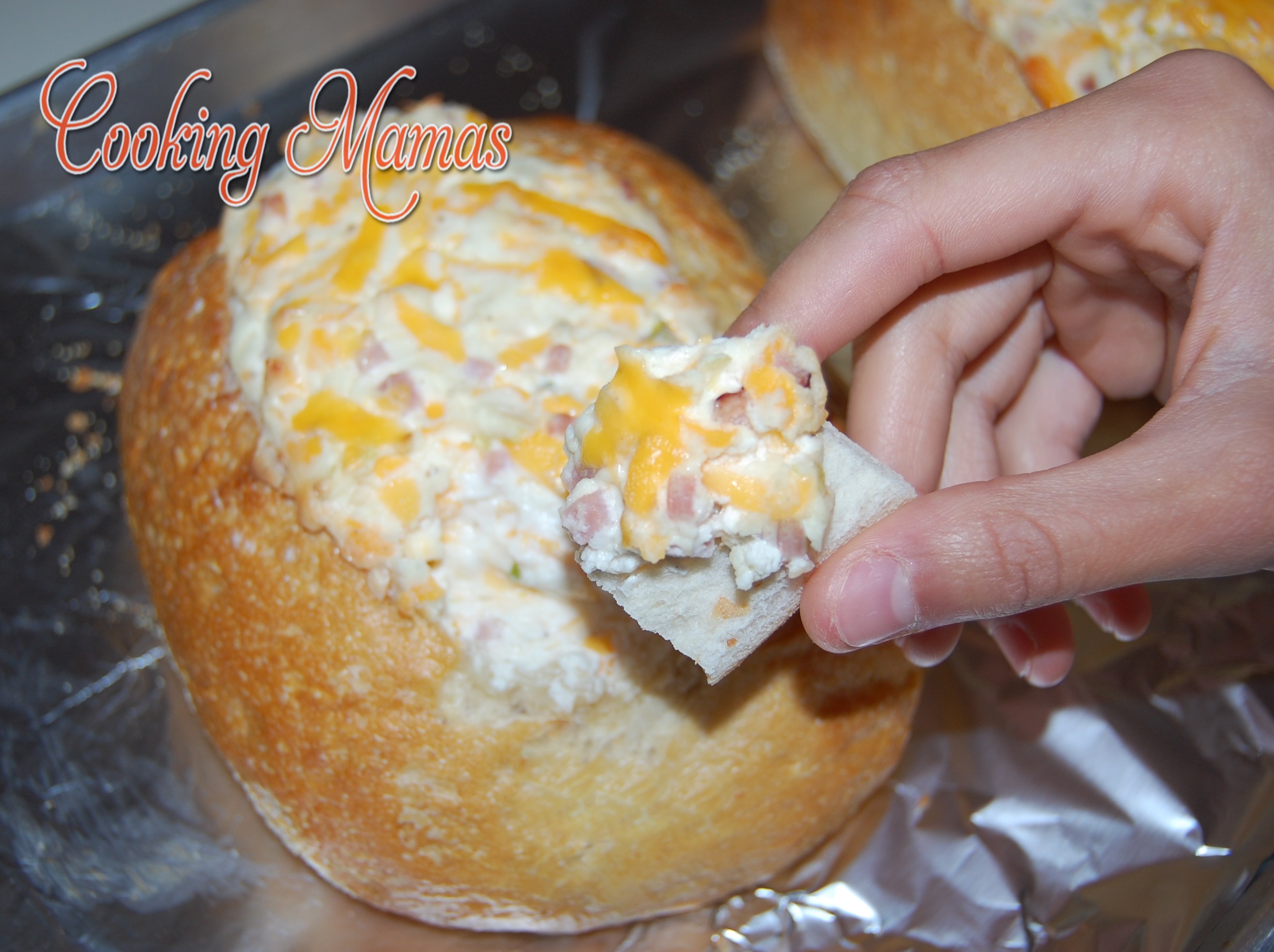 - Cube the center of the loaf for dipping later. Fill hollowed bread with the cream cheese dip. Wrap loaf in foil.