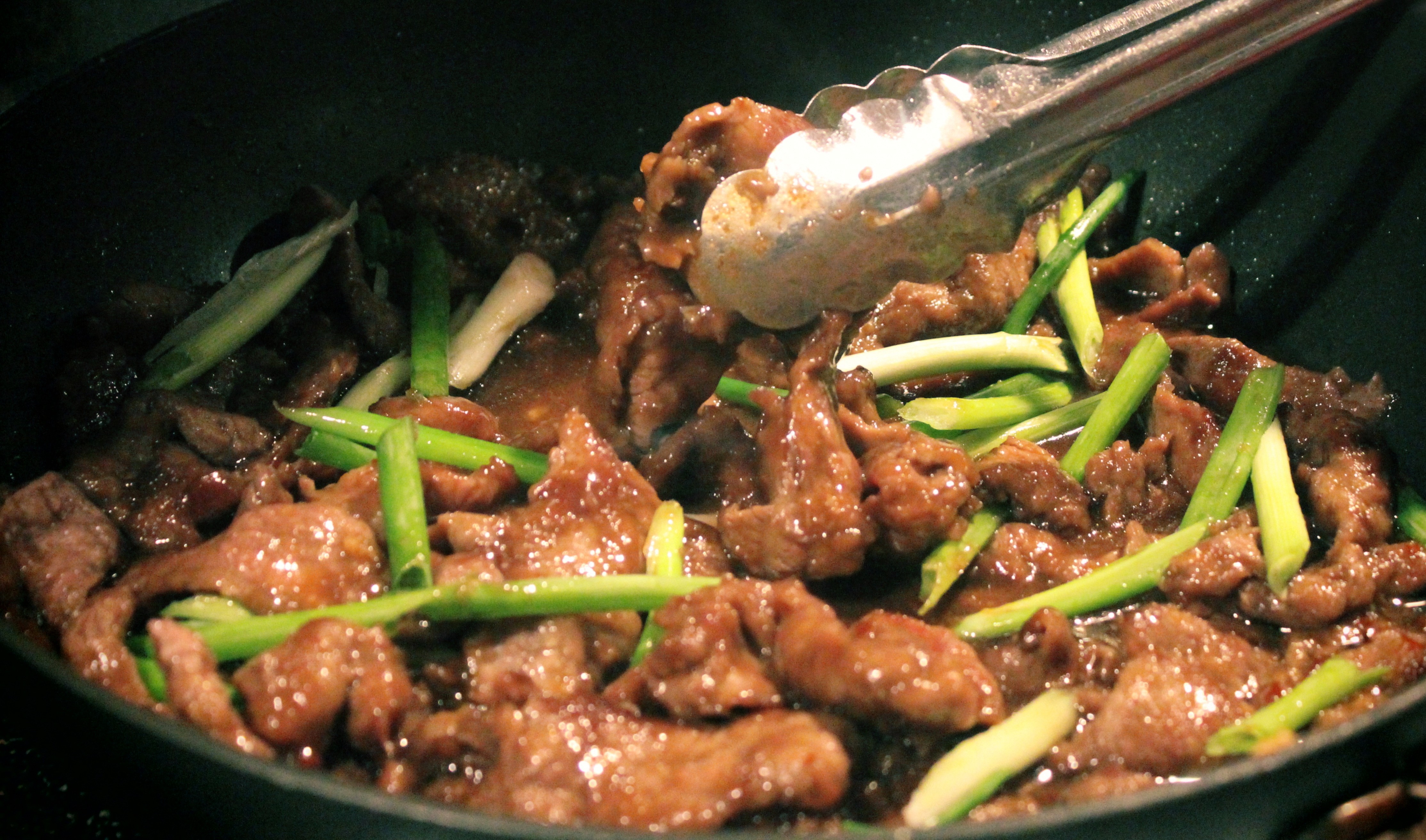 - Turn the heat up and add the remaining oil to the wok. Add the beef and cook, stirring until it is all browned (this is a quick thing). Pour the sauce back into the wok and let it cook along with the meat. Now you can choose to cook it down and reduce the sauce or leave it thinner. Add the green onions at the last minute so the green parts will stay green and the white parts crunchy. Serve hot over rice.