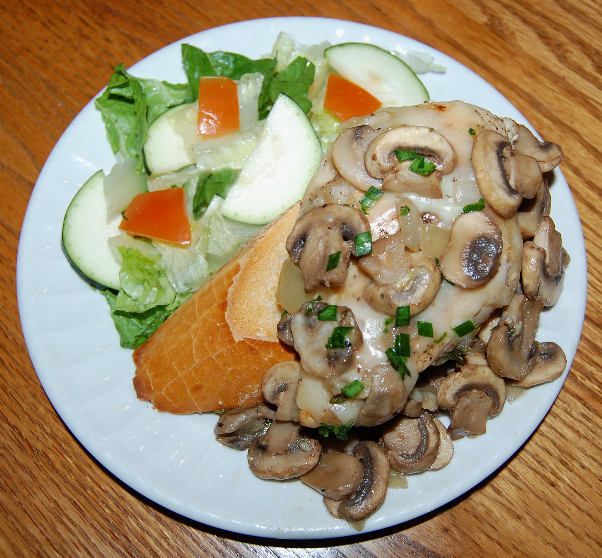 - Meanwhile, toast bread, then rub with garlic clove. To plate, place chicken with mushrooms and melted cheese over garlic toast, sprinkle with chives. Serve with a garden salad.