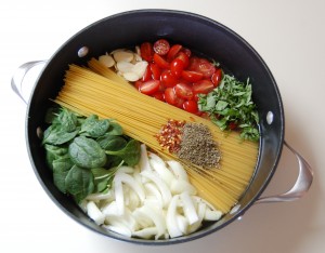- Combine pasta, tomatoes, spinach, onion, garlic, Italian seasoning, red pepper flakes, chopped basil, olive oil, and broth in a large pot.