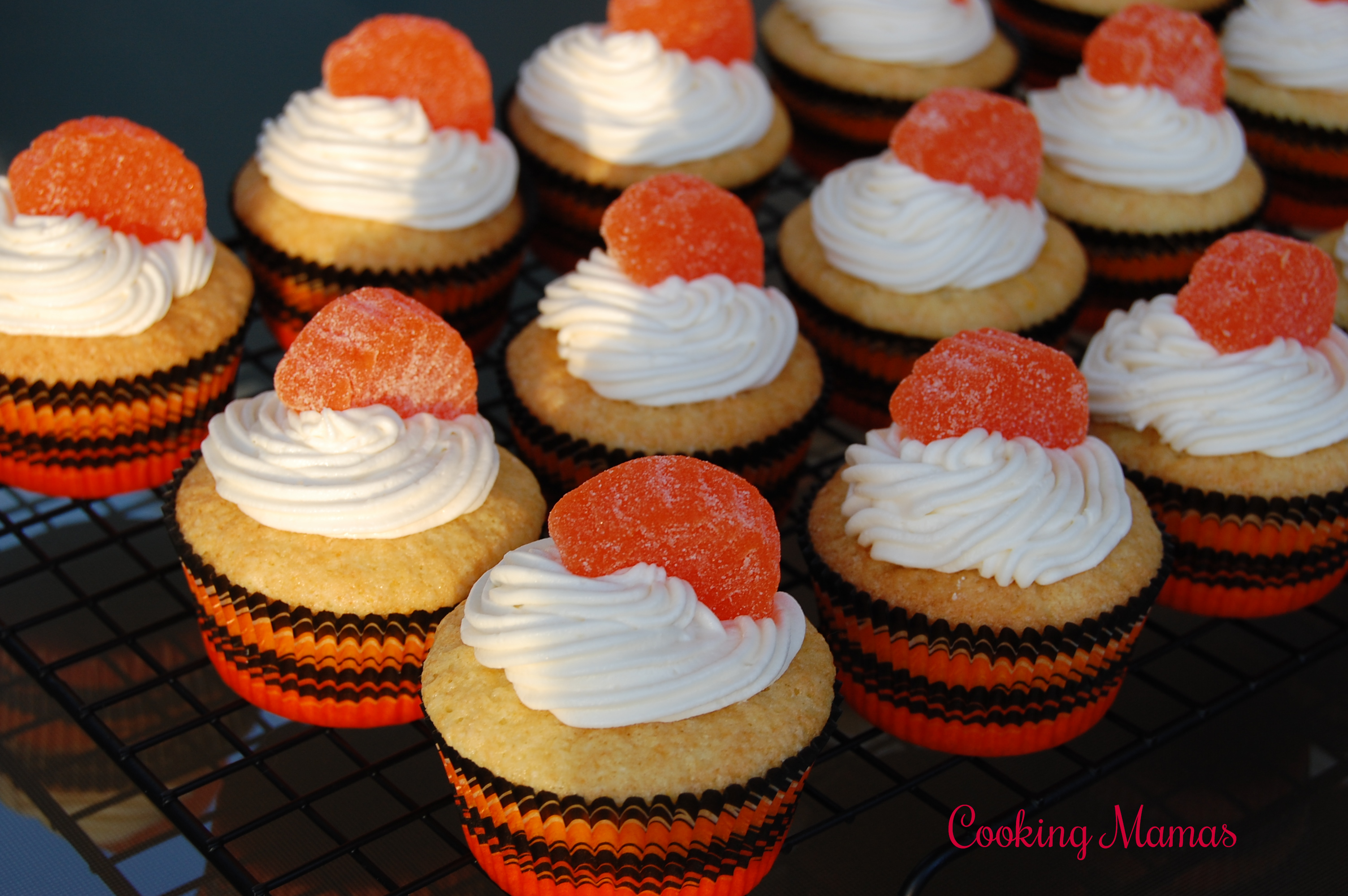 Orange cupcakes topped with vanilla buttercream frosting and orange candy slices!