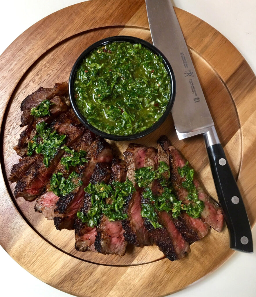 - Cut steaks diagonally across the grain into thin slices. Spoon chimichurri sauce over steaks and devour!