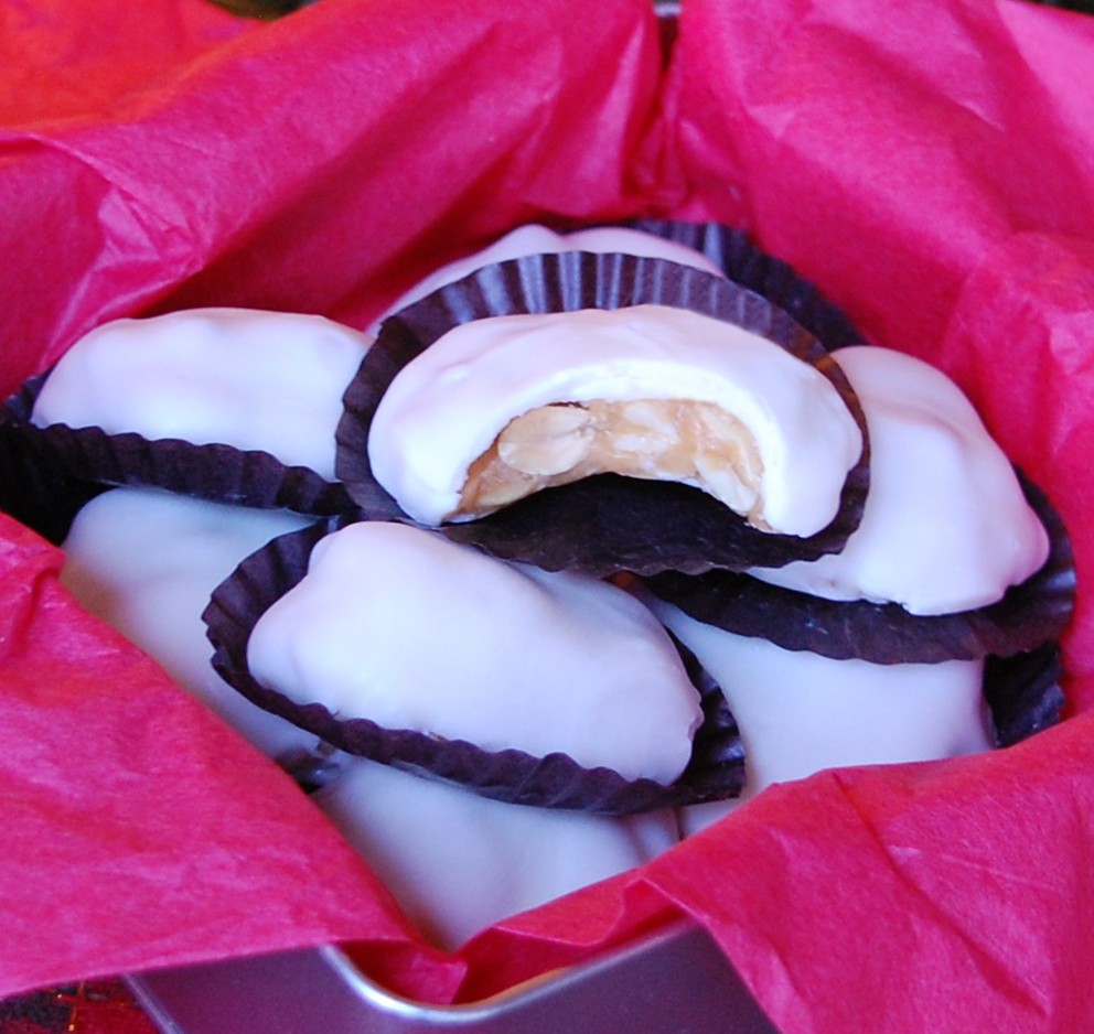 Roasted peanuts and buttery caramel clusters enrobed in white chocolate.