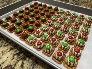 - Preheat the oven to 200 degrees. Line a rimmed baking sheet with Silpat or parchment paper. Align pretzels on the prepared baking sheet in a single layer. Top half of the pretzels with Hugs and half with Kisses.