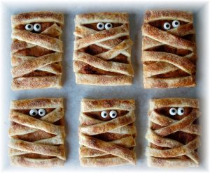 - EGG WASH: In a small bowl, combine egg white and 1 tablespoon water to make an egg wash. Using your finger brush the edges with the egg wash. Top with strips to create a mummy, then seal the edges with your fingertips and trim the excess of the stripes. Brush the stripes with egg wash and sprinkle with cinnamon sugar.