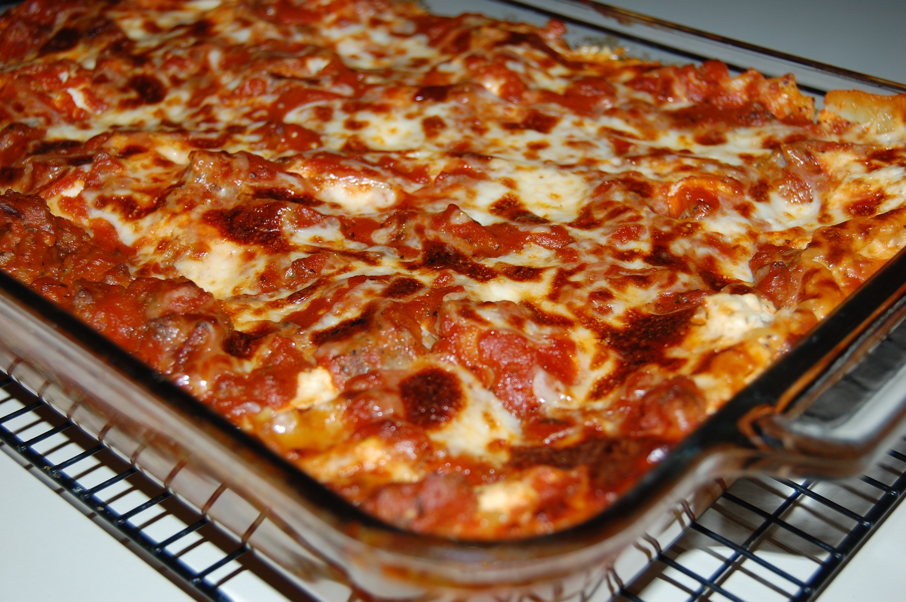 - Spread 1 cup sauce mixture over bottom of a 9x 13-inch baking dish. Top with 4 lasagna noodles. Spread 1 cup ricotta mixture over noodles. Sprinkle with 1 cup mozzarella cheese. Pour 1 cup sauce mixture over mozzarella cheese, top with remaining 4 lasagna noodles, remaining ricotta mixture and remaining sauce mixture. Sprinkle with remaining 1/2 cup mozzarella cheese. Pour hot water around edges of lasagna. Cover with foil.