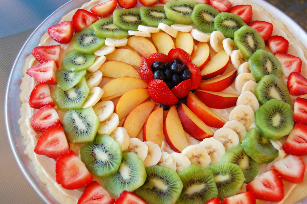 - Cook's Note: For a quick crust, use one package of ready- made sugar cookie dough rolled out to fit a pizza pan and bake as directed. Use an assortment of fresh fruit. I used 1 lb. strawberries cut into thirds, 2 bananas, 3 nectarines, 5 kiwis, and a 1/4 cup of blueberries. If using bananas, place them on just before serving as the turn brown quickly.