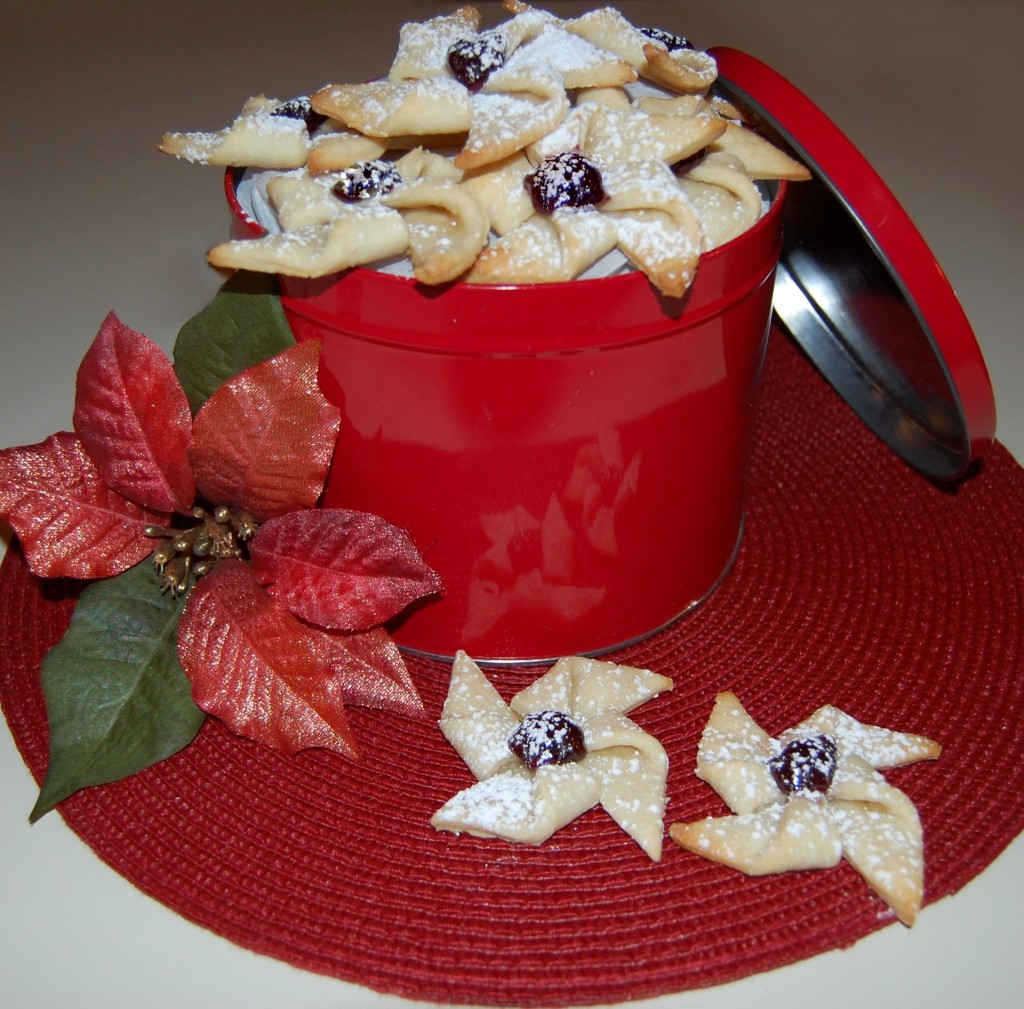 A festive raspberry filled shortbread cookie, perfect for the holidays!
