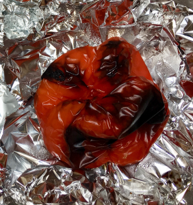 - Preheat oven to 500 degrees. Roast peppers on a foil-lined baking sheet until charred about 20-25 minutes. Remove from the oven and cover peppers with foil for 10 minutes allowing them to steam. Peel charred skin remove seeds and stems; set aside.