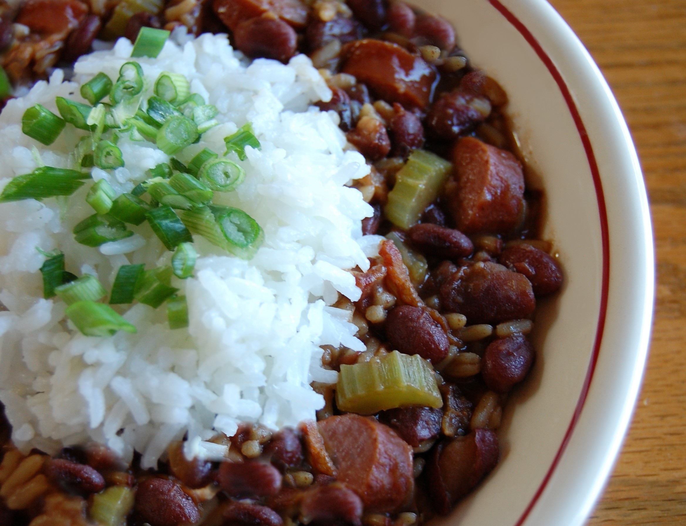 - Remove from the heat and with the back of a heavy spoon, mash about 1/4 of the beans against the side of the pot. Continue to cook until the beans are tender and creamy, 15 to 20 minutes. Remove from the heat and remove the bay leaves. Serve over rice and garnish with green onions.
