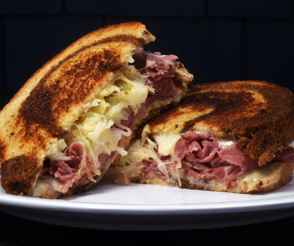 A classic Reuben is corned beef piled high with Swiss cheese, sauerkraut, and thousand island dressing sandwiched between grilled light, dark, or marble rye bread. Substitute pastrami for the corned beef and top with coleslaw instead of sauerkraut and you have yourself a Rachel, Enjoy!