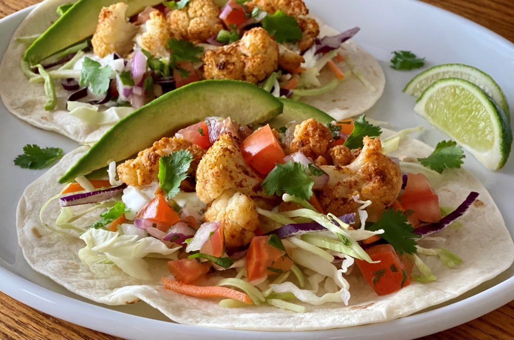 - Once the cauliflower is done, simply fill warm tortillas with cabbage, cauliflower, cilantro lime crema, Pico de Gallo, avocado slices, cilantro leaves, and a squeeze of lime, Enjoy!