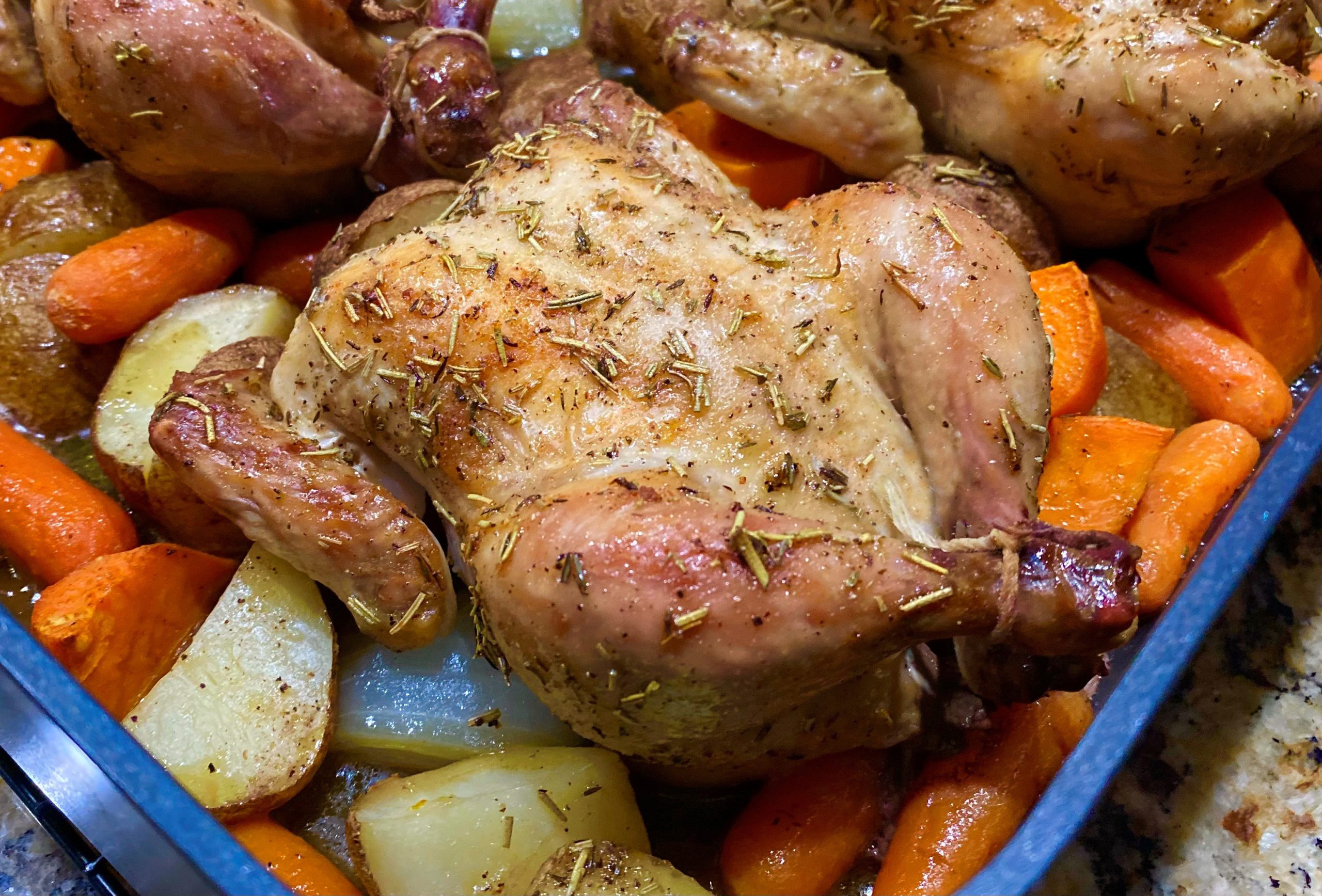 - Remove the hens from the oven and loosely cover with foil. Rest for 10 minutes before cutting. Carefully cut hens in half with kitchen shears and serve with veggies.