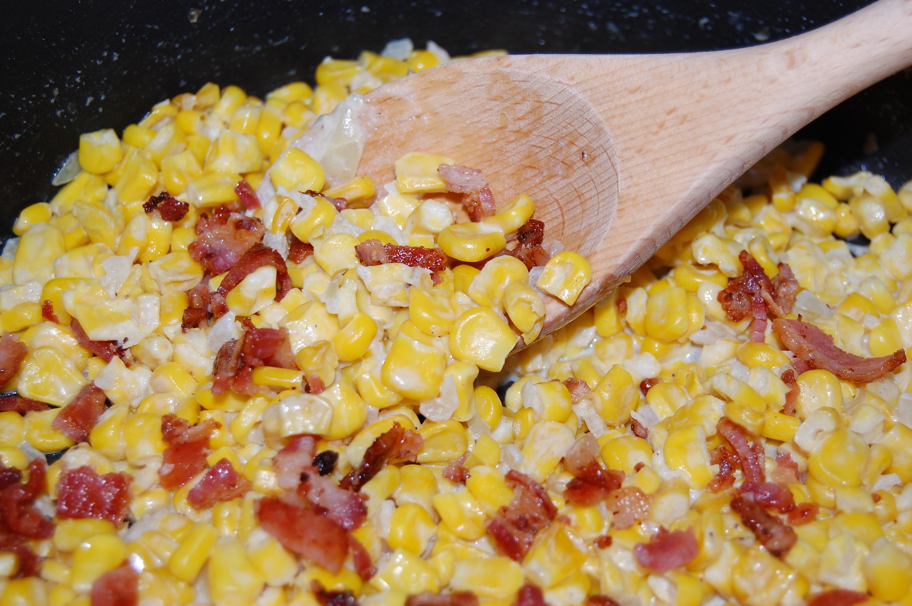 - Grate 8 ears corn into a medium bowl. In a large heavy pot, cook bacon over medium-high until crisp. With tongs, transfer to paper towels to drain. Add onion to the pot and cook until soft, about 8 minutes.