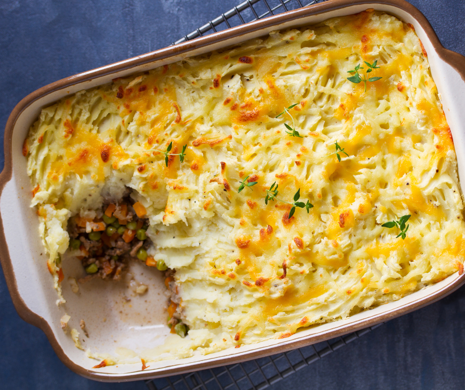 A delicious meat and veggie pie topped with creamy mashed potatoes and cheddar cheese.