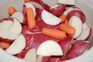 - Place the roast in the bottom of the slow cooker. Pour seasoning mixture over roast. Add baby red potatoes and carrots if desired.