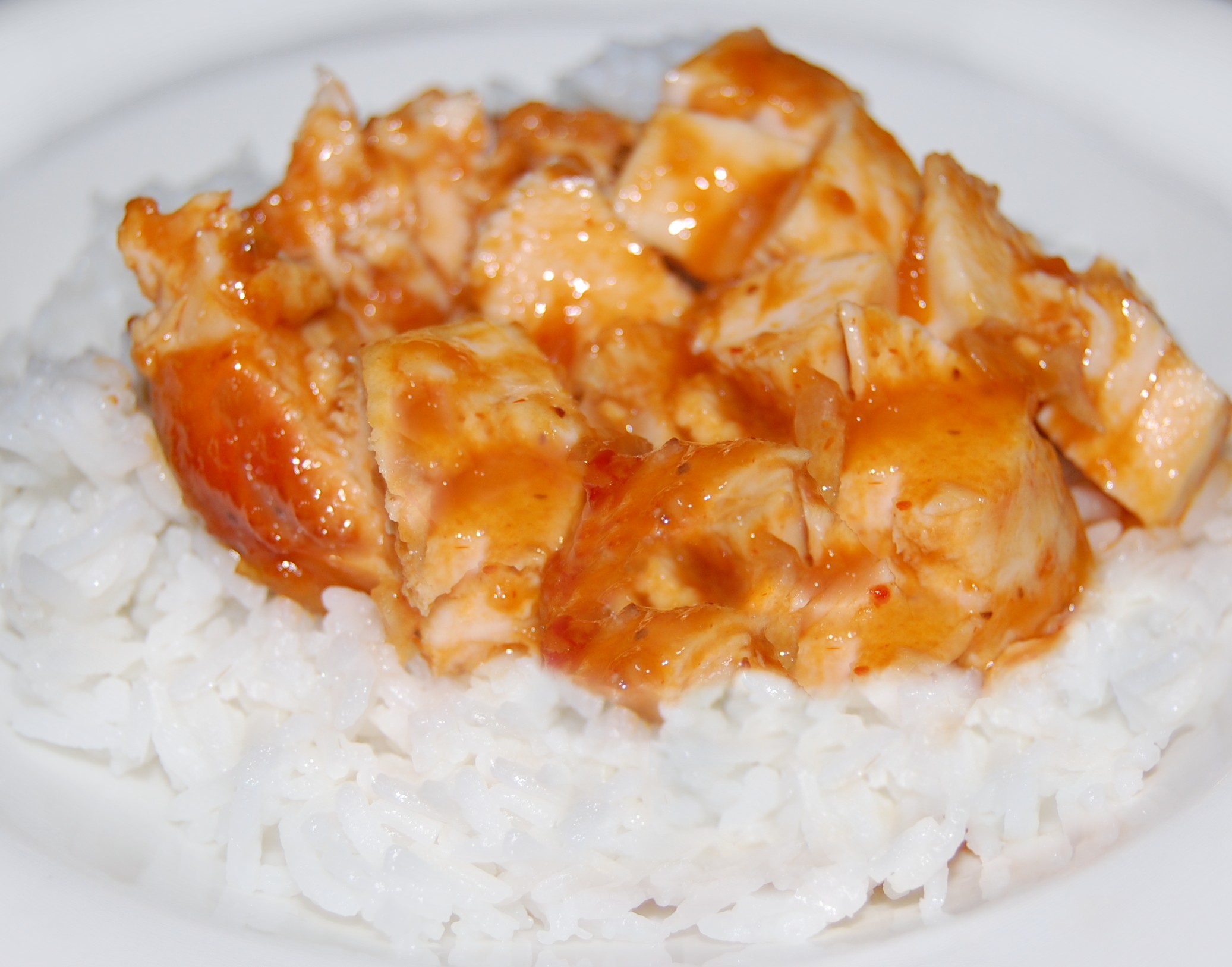 - Before serving, cut the chicken into bite-sized pieces. Serve chicken and sauce over rice or cous cous.