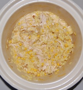 - Remove chicken and shred with two forks, return to slow cooker. Stir in cooked rice, corn and cheese, cover and cook until heated through, about 5-10 minutes more. Garnish with more grated cheddar cheese before serving, if desired.