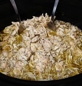 - Remove the lid and shred the chicken with two forks. Keep the chicken in the juices it cooked in until ready to serve.