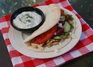Tender slow cooked chicken wrapped in warm pita bread, topped with homemade Tzatziki sauce and your choice of toppings!